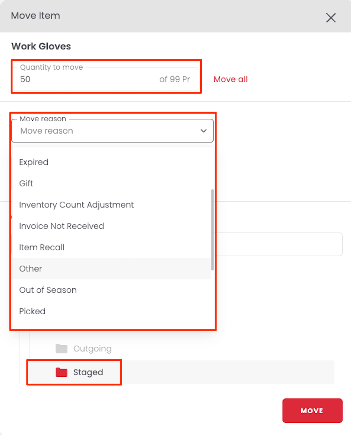 (Optional) Add a move reason or a note for record-keeping.