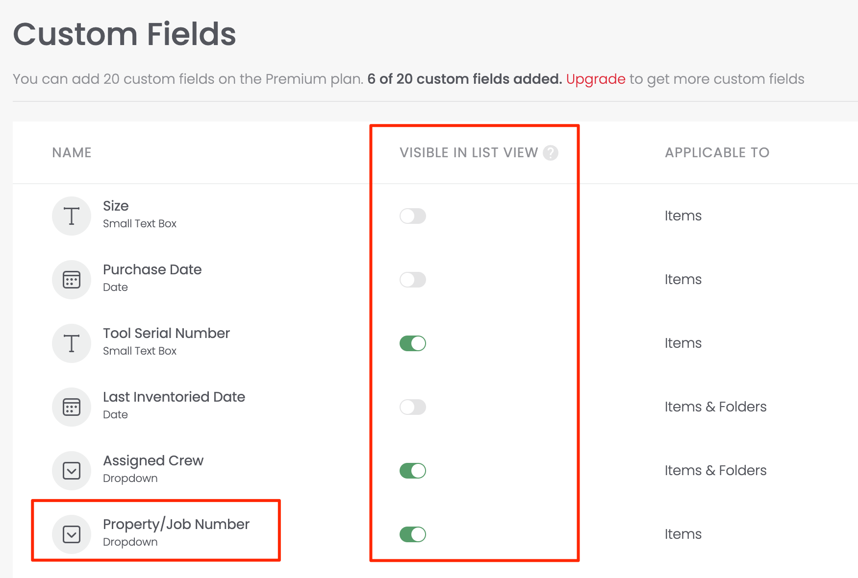 The screenshot above has marked the Property/Job Number custom field as Visible in List View. This way, if you view your items in List (as opposed to Grid or Table), you'll see the field at a glance: