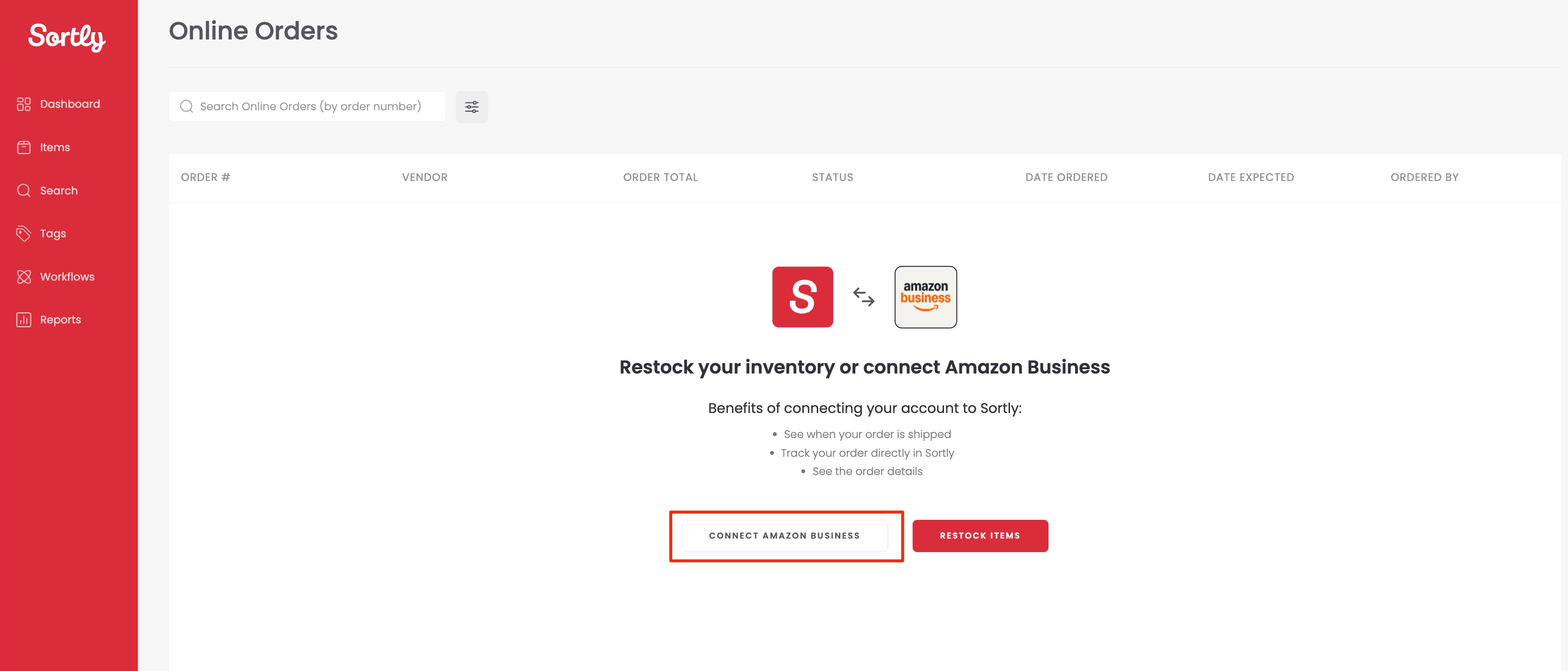 Once connected, Sortly will automatically sync your Amazon Business orders from up to one month before your connection date. You’ll find these in Workflows → Online Orders.