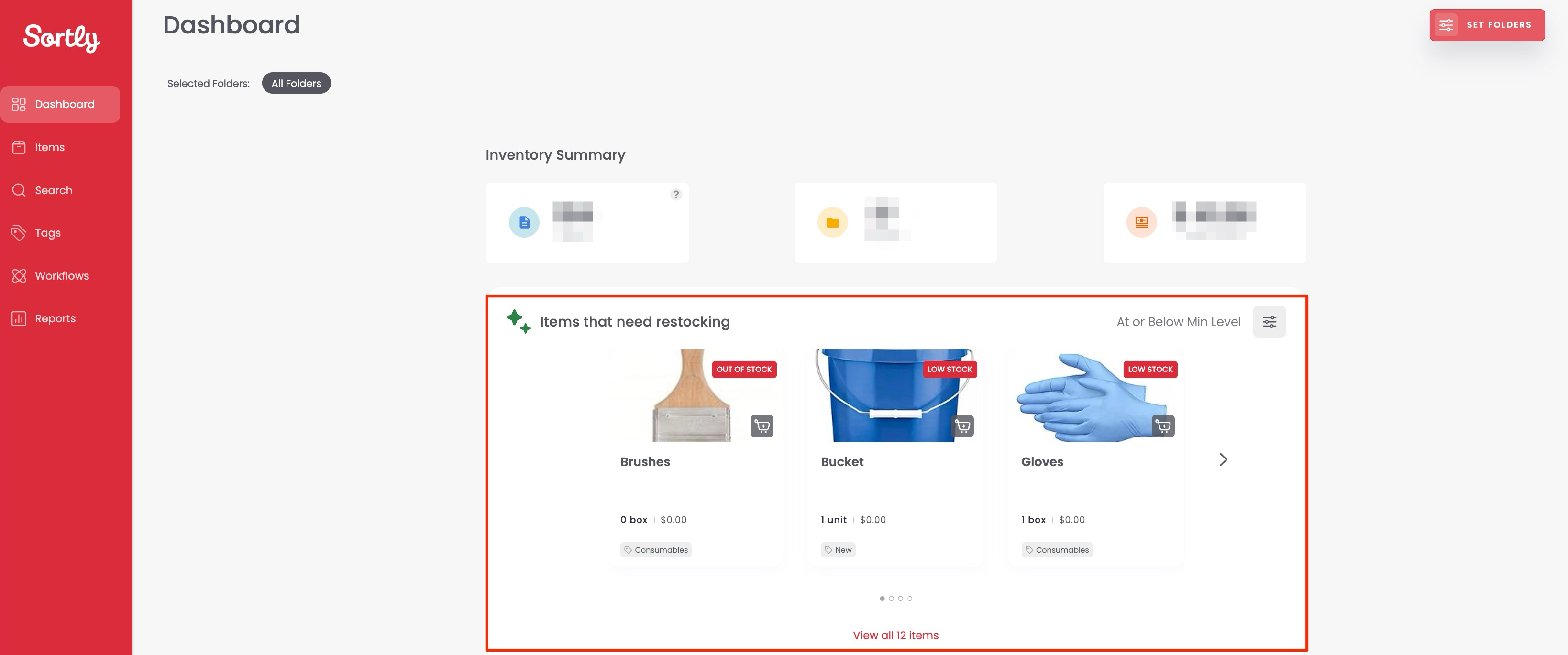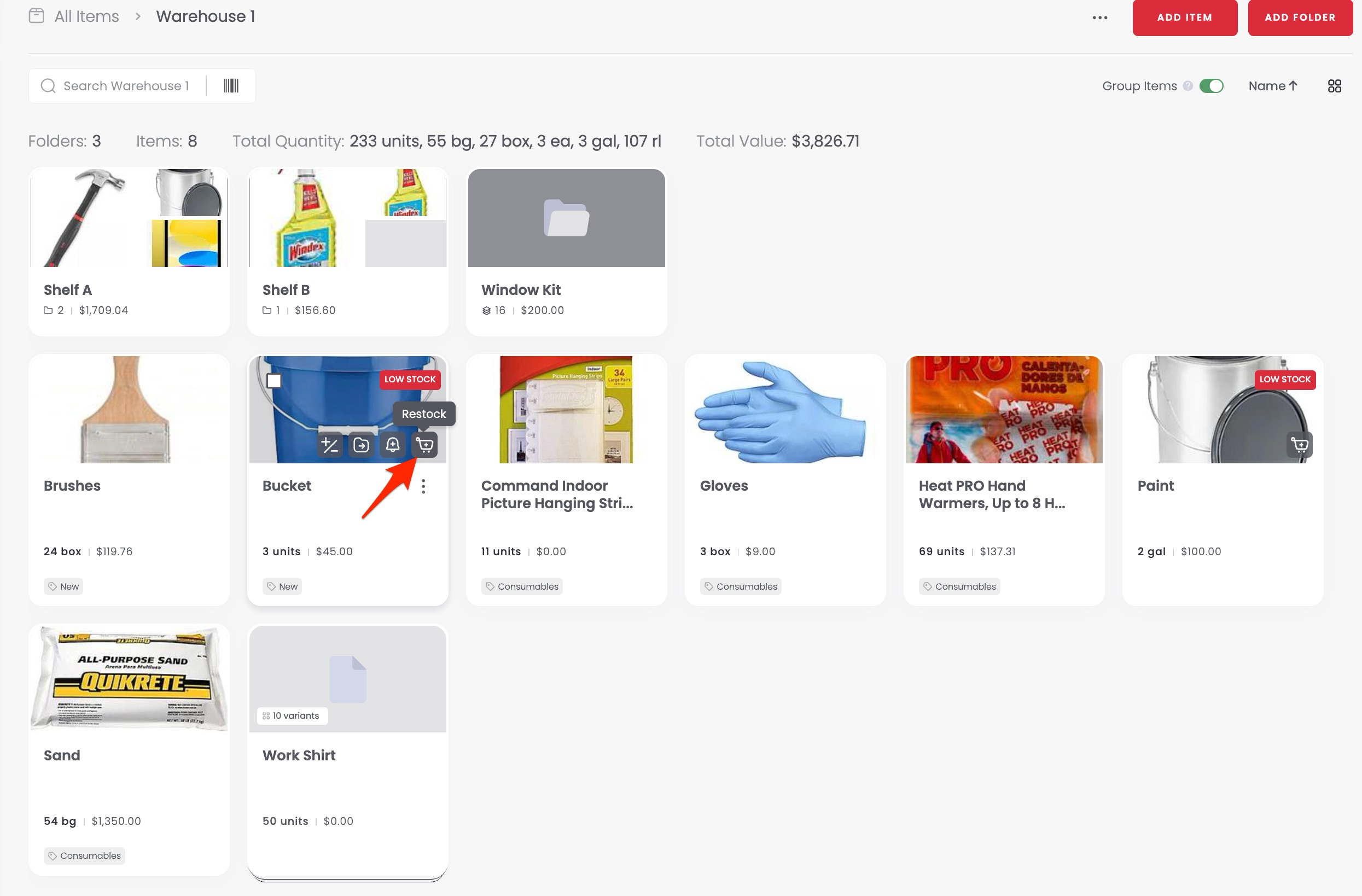 If an item is Low Stock or Out of Stock, a shopping cart with a “+” appears on the item card. Click it to restock.