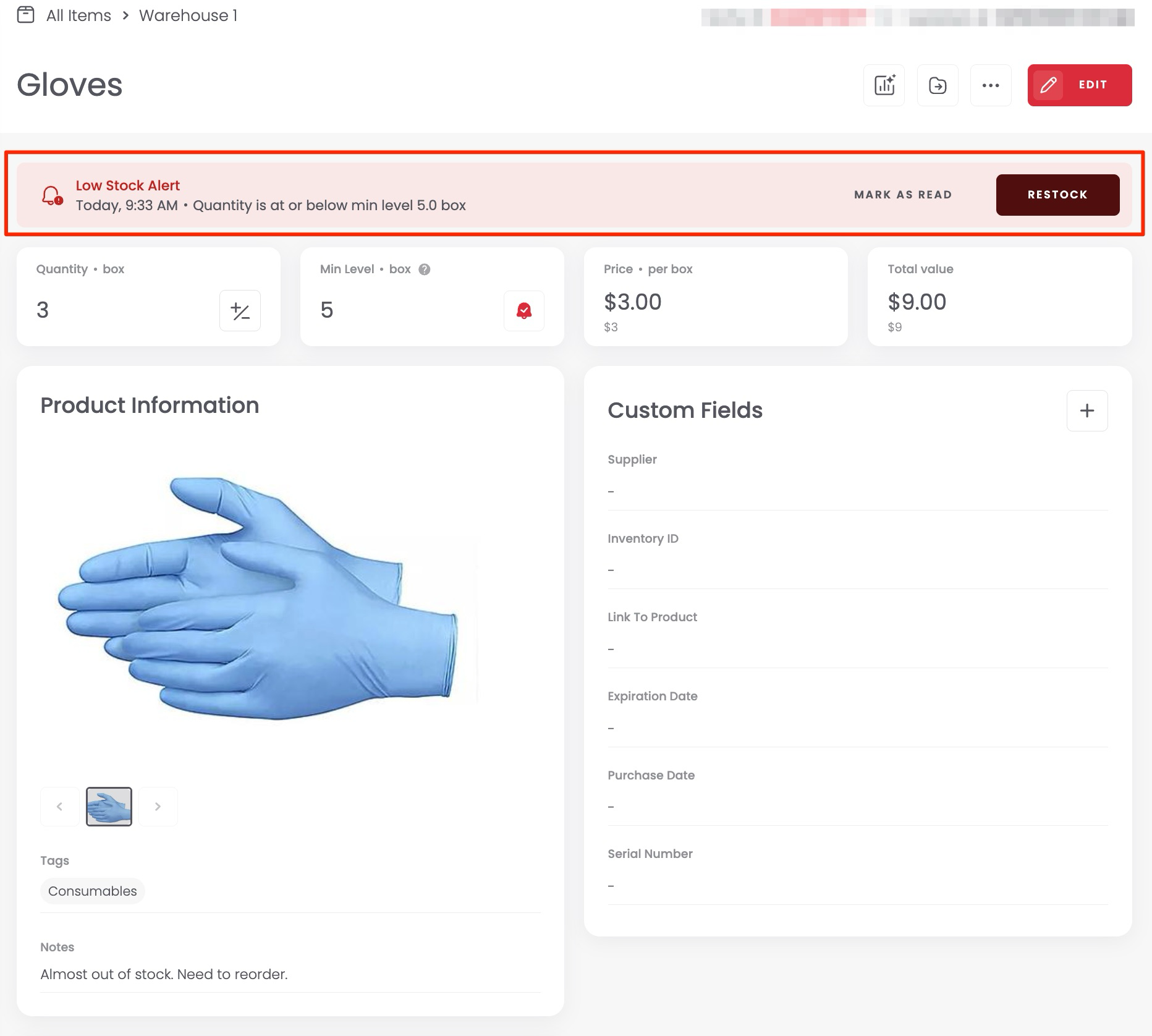 When an item is running low or out of stock, Sortly gives you a quick way to reorder right away. You don’t need to make a list first—the restock option shows up automatically where you’re already working.