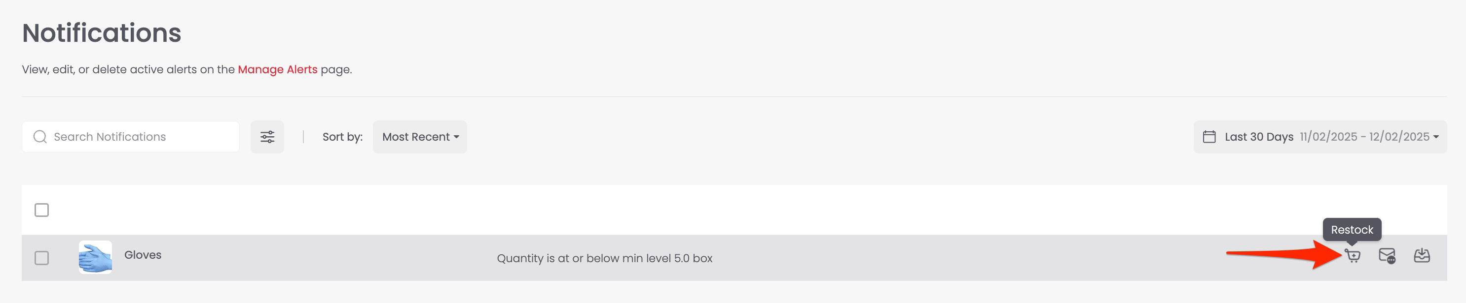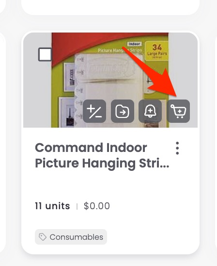 For items that aren’t low yet, hover over the item card to reveal the restock icon, then click it.
