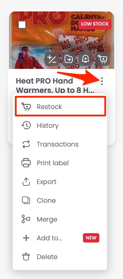 Restock appears on item cards, item detail pages, dashboard, notifications, low-stock emails, and the reorder page. You can also open it from the three-dot menu on an item.